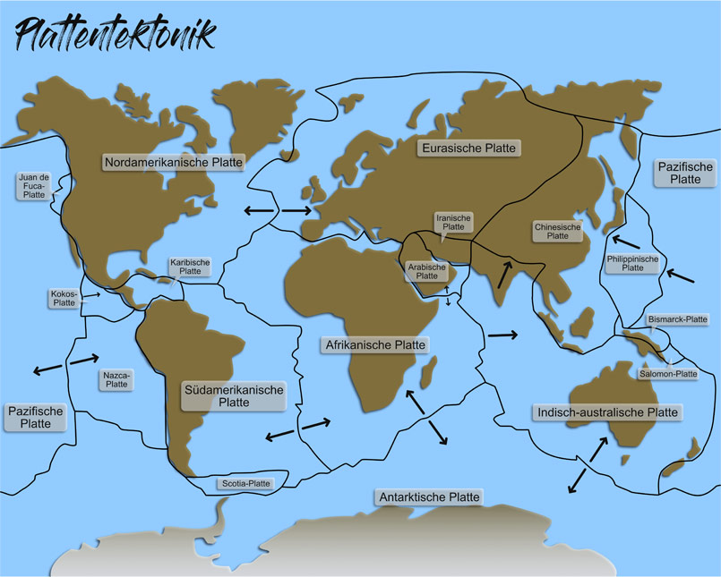 Die Erdkruste, also die oberste Schicht der Erde, besteht aus verschiedenen Platten, die durch wärmebedingte Bewegungen im Erdinneren in ständiger Bewegung sind und verschoben werden. Diese Platten werden auch tektonische Platten genannt. Durch die Bewegung reiben diese aneinander und können sich verhaken. Dabei werden Spannungen aufgebaut, die sich plötzlich und ruckartig entladen können und in Form von verschiedenen Erdbebenwellen als Erdbeben wahrgenommen werden können. Der Aufbau der Spannung kann jedoch Jahrzehnte bis Jahrhunderte dauern, während die Entladung meist nur wenige Sekunden bis Minuten dauern kann. Häufig erfolgen mehrere Beben hintereinander, um die Spannung abbauen zu können.