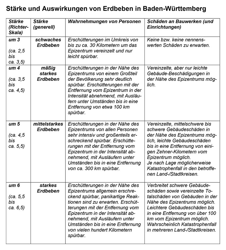 Schwache, in der Regel nicht spürbare Erdbeben, werden in und um Baden-Württemberg fast täglich gemessen. Etwa einmal im Monat kommt es bei uns zu lokal leicht spürbaren Erdbeben. Rund einmal pro Jahrzehnt kann ein mittelstarkes Erdbeben regional zu Gebäudeschäden und Betriebsstörungen führen. Starke Erdbeben mit katastrophalen Auswirkungen sind in Baden-Württemberg selten, aber nicht ganz ausgeschlossen.