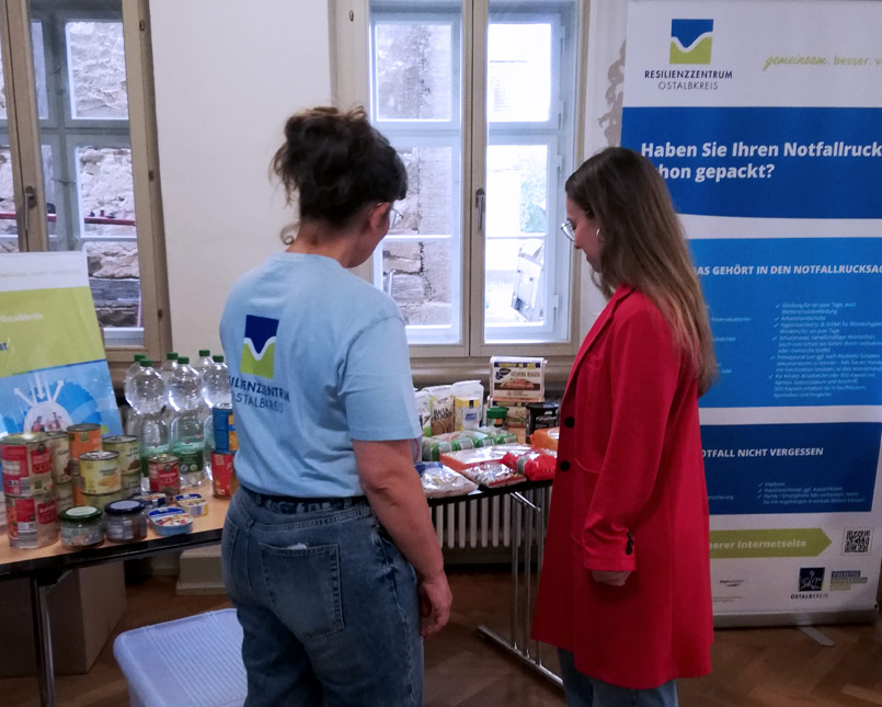 Das Resilienzzentrum, bot damit in Zusammenarbeit mit der Gemeindeverwaltung Mögglingen der Bevölkerung die Möglichkeit sich zu Themen wie die allgemeine Notfallvorsorge, Verhalten bei Überflutungsereignissen und Stromausfällen sowie Tipps zum Selbstschutz in Krisensituationen zu informieren. Interessierte konnten sich an verschiedenen Stationen von Mitarbeitenden Resilienzzentrums alles erläutern lassen und eigene Fragen stellen. Anschauliche Materialien, darunter ein beispielhafter Notvorrat, ein gepacktes Notgepäck, eine Dokumentenmappe und einiges mehr, zeigten außerdem, wie gut Vorbereitung auch im Kleinen gelingen kann. Besonders gefragt war der Blick auf die Hochwasser- und Starkregengefahrenkarten – viele wollten wissen, wie gefährdet ihre Wohnlage im Ernstfall ist. Vor Ort wurde erklärt, wie diese Karten abgerufen und richtig gelesen werden können.